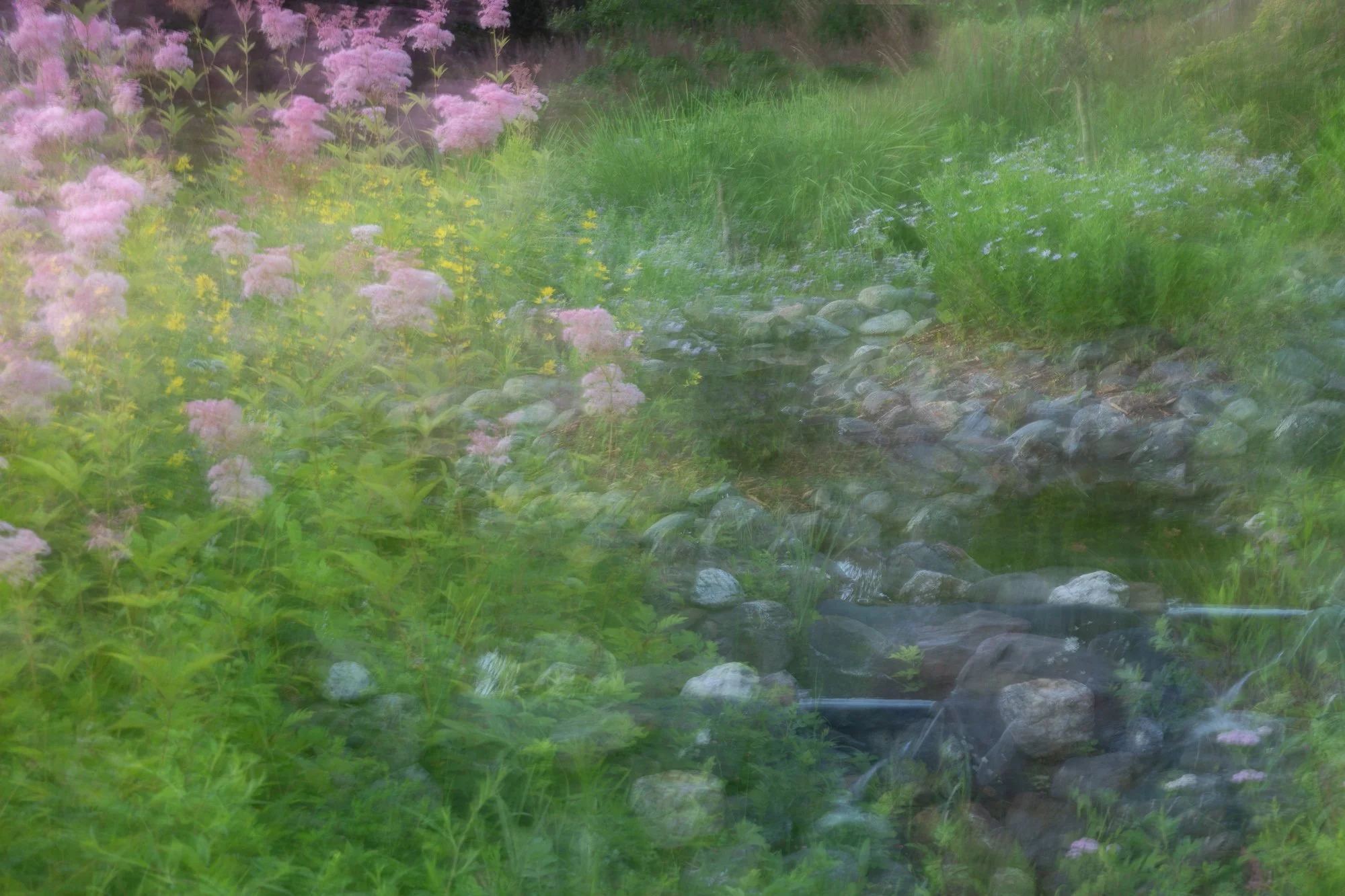 The open discussion and having a goal of producing material from the workshop to present in an “exhibit” style wrap up event helped to focus my activities around developing a cohesive bodies of work rather than creating a group of random images. I found that my garden images were bold and vibrantly colourful with dramatic exposures to capture my feelings of awe from the beauty of the surroundings. Then there was a series of very soft pastel coloured ICM (intentional camera movement) images that captured more of the feeling of movement and art that I experienced.